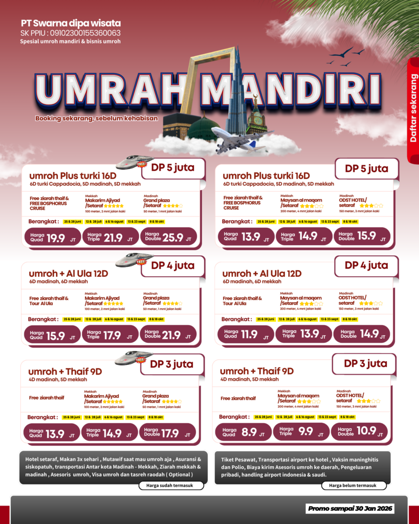 Umroh Mandiri merupakan suatu program untuk membantu kamu agar bisa umroh dengan budget terbatas, namun tetap bisa beribadah dengan nyaman. Cukup cari dan beli tiket pesawat susuai tanggal keinginanmu dan sisa nya serahkan sama Shahara Wisata untuk membantu mu!